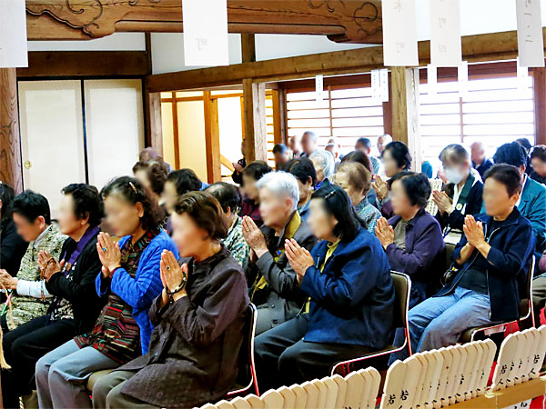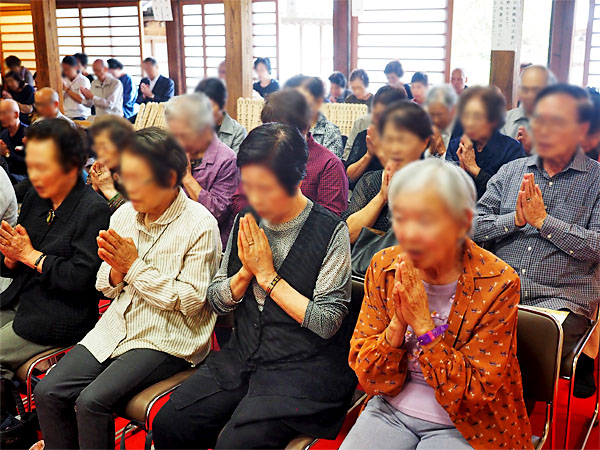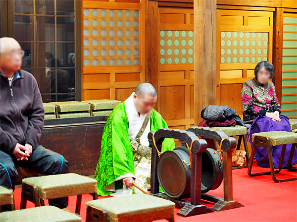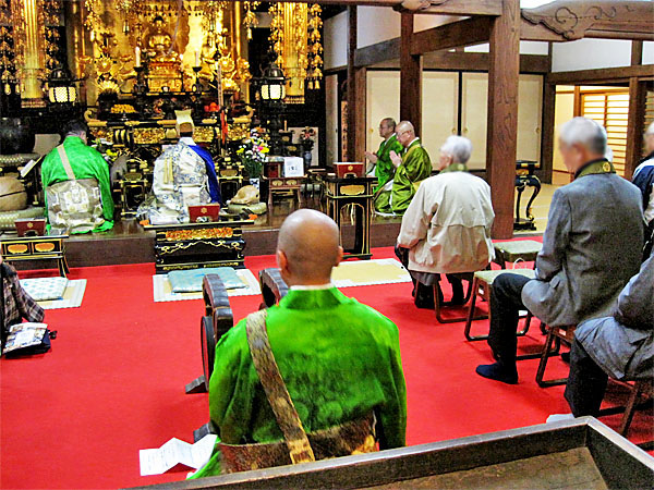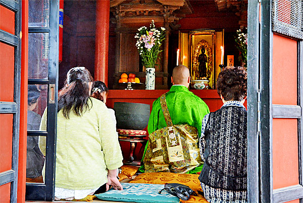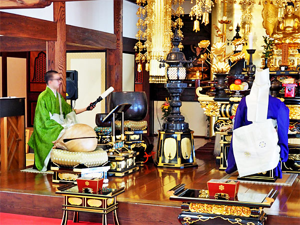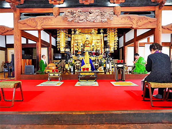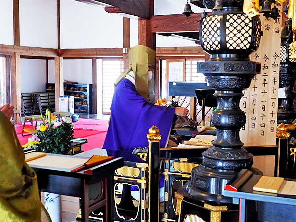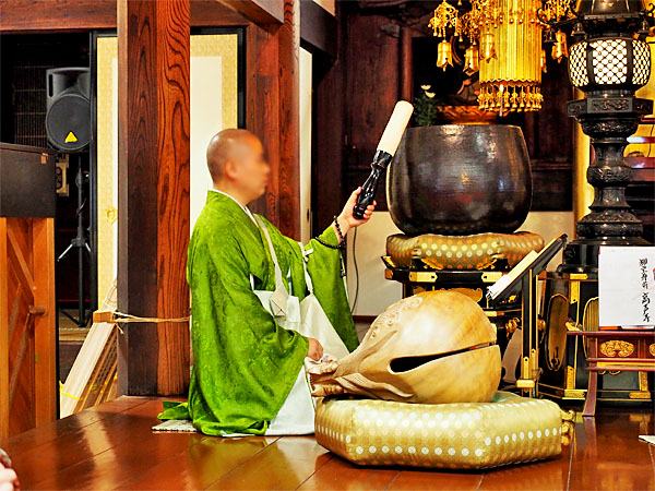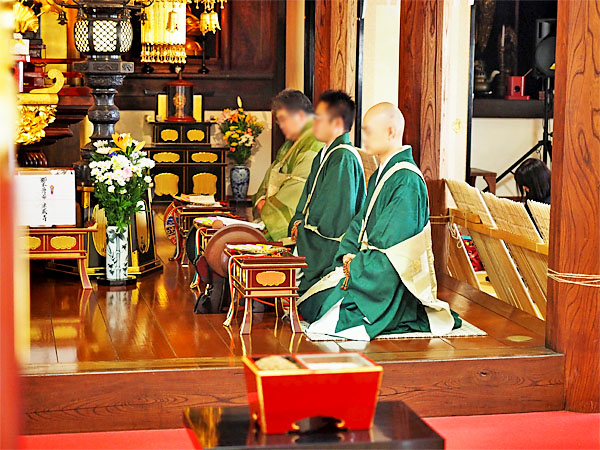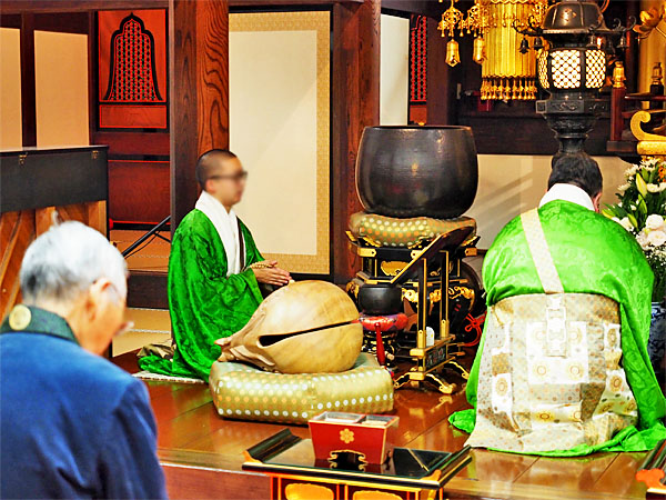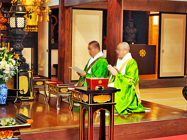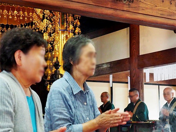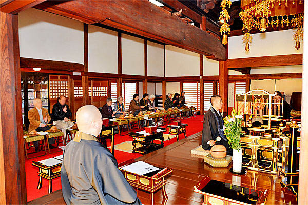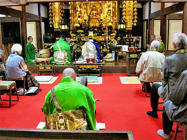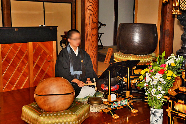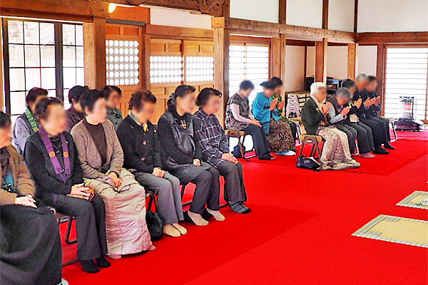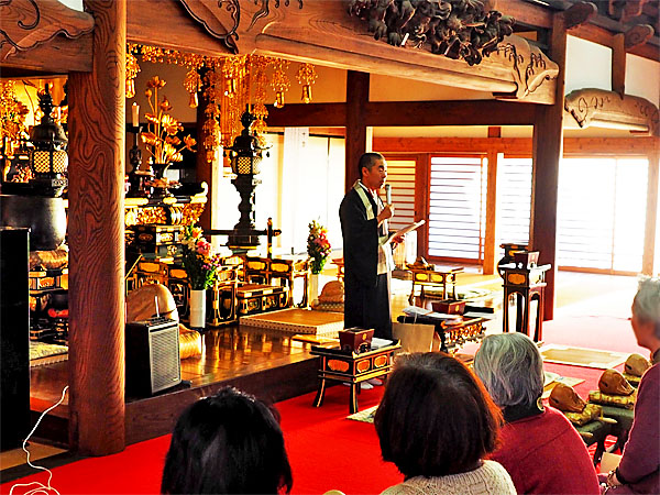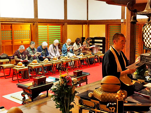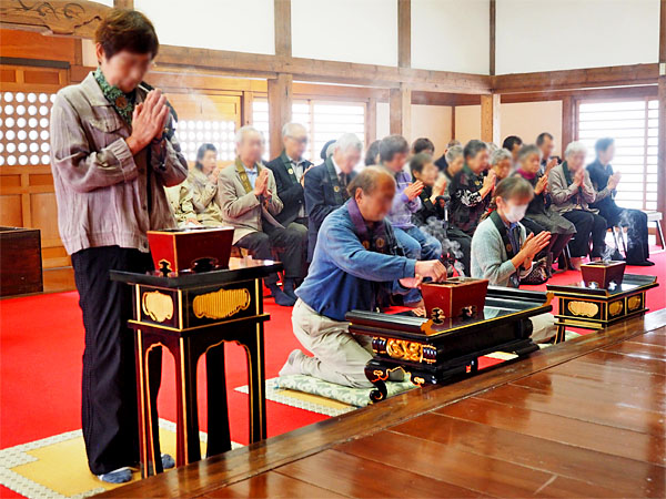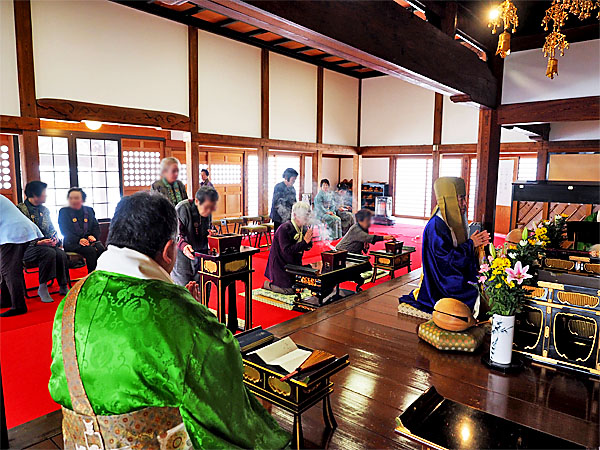 分かり易い経本がありますので、それを読んだり、念仏を唱えたり、住職の講話などを聞きます。