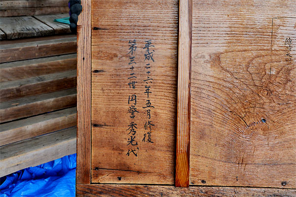 平成26年9月30日、弁財天の賽銭箱の木材を利用して額縁に再利用致しました。